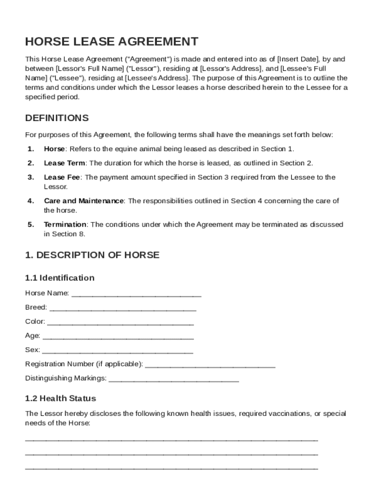 This document outlines the terms and conditions under which a horse is leased from a Lessor to a Lessee, including responsibilities, lease term, lease fee, and termination conditions.