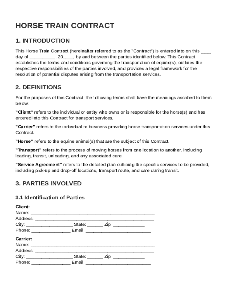 A horse train contract is a legally binding document outlining the terms and conditions between a horse owner (the Client) and a transportation service provider (the Carrier). It serves as an essential tool to ensure that both parties understand their responsibilities and obligations regarding the transport of horses.