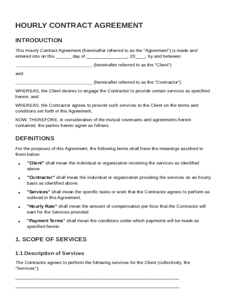 This document serves as a contractual agreement between a Client and a Contractor outlining the terms of service, compensation, confidentiality, and liability associated with hourly work.