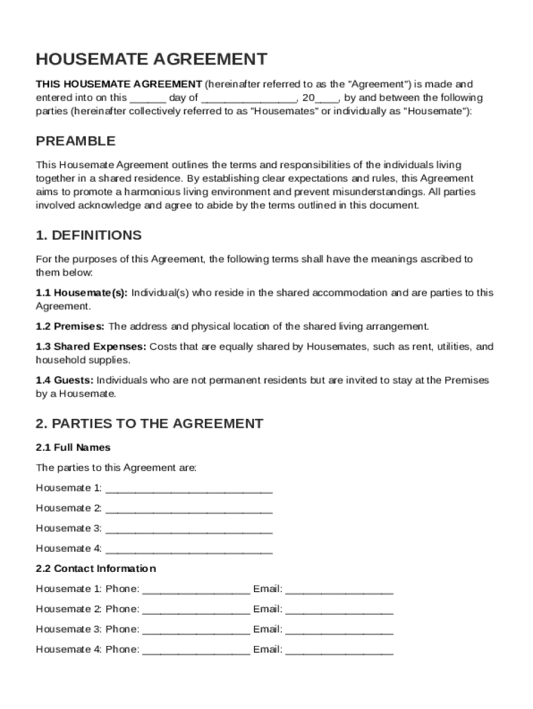 This Housemate Agreement outlines the terms and responsibilities of individuals living together in a shared residence to promote a harmonious living environment and prevent misunderstandings.