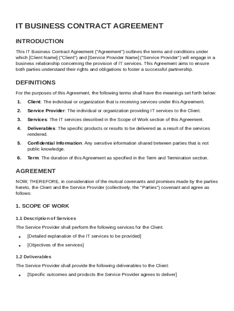 An IT Business Contract Template is a standardized document used to outline the terms and conditions of a business agreement between IT service providers and clients.