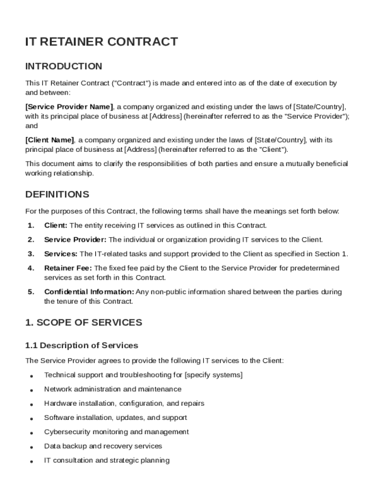 A comprehensive IT retainer contract should include multiple key components that outline both parties' roles and scopes of work. Each section must be carefully crafted to prevent misunderstandings and ensure a smooth service delivery experience.