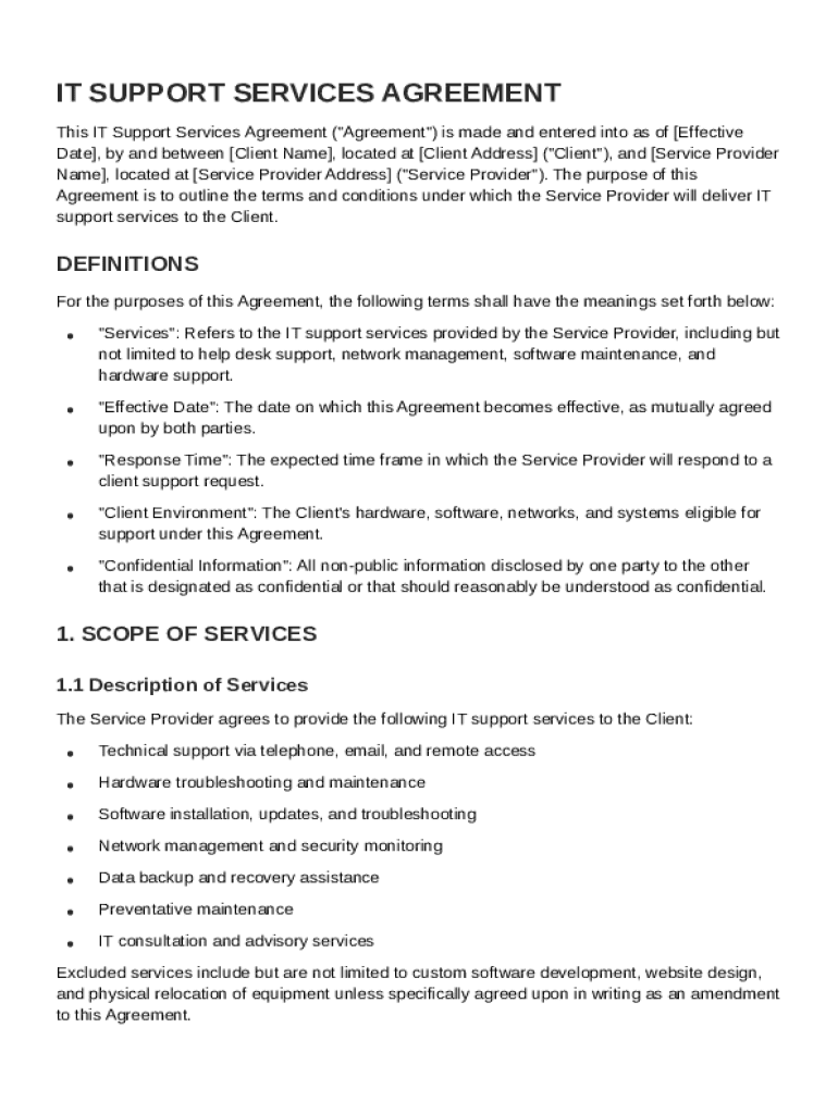 An IT Support Services Agreement defines the support provided and serves as a reference point to resolve disputes.
