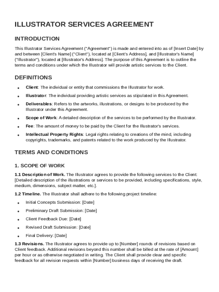 This document outlines the terms and conditions under which the Illustrator will provide artistic services to the Client, including definitions, scope of work, compensation, intellectual property