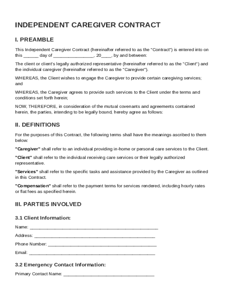 An Independent Caregiver Contract defines the services to be rendered, compensation, and other important terms.