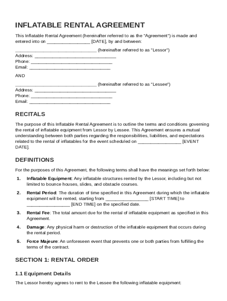 This document outlines the terms and conditions governing the rental of inflatable equipment, ensuring mutual understanding between the Lessor and Lessee regarding responsibilities, liabilities, and