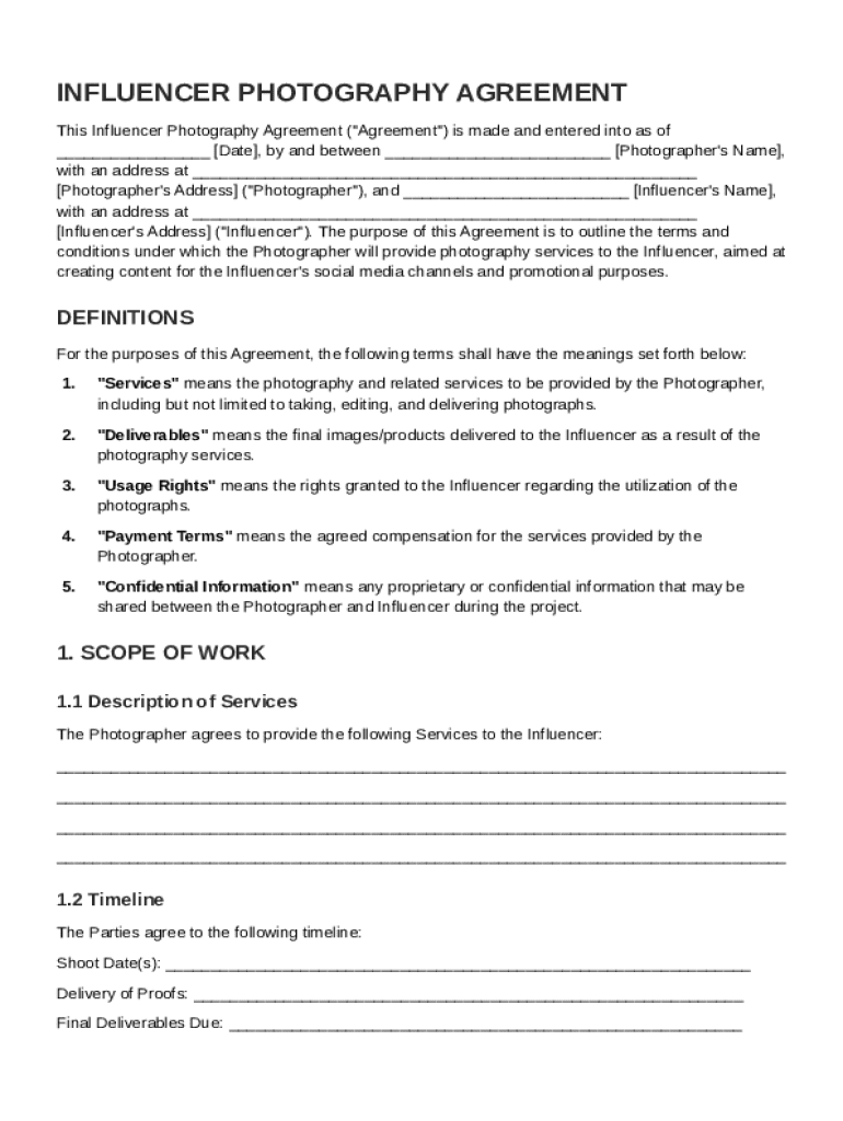 An Influencer Photography Contract Template is a legal document outlining the terms and conditions between a photographer and an influencer for a photoshoot.
