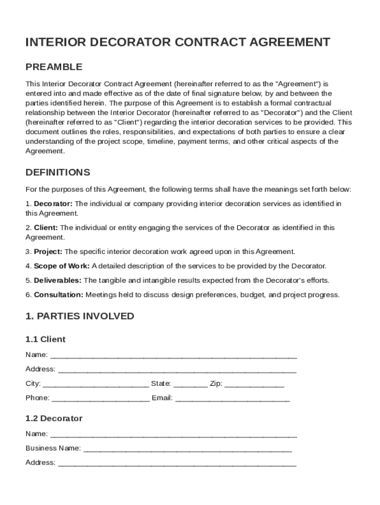 An Interior Decorator Contract Template is a formal agreement outlining the terms and conditions between a client and an interior decorator for a specific project.