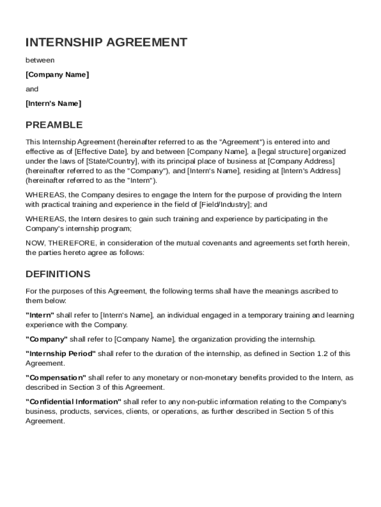 This document outlines the terms and conditions of an internship between a company and an intern, including definitions, responsibilities, compensation, confidentiality, and termination conditions.