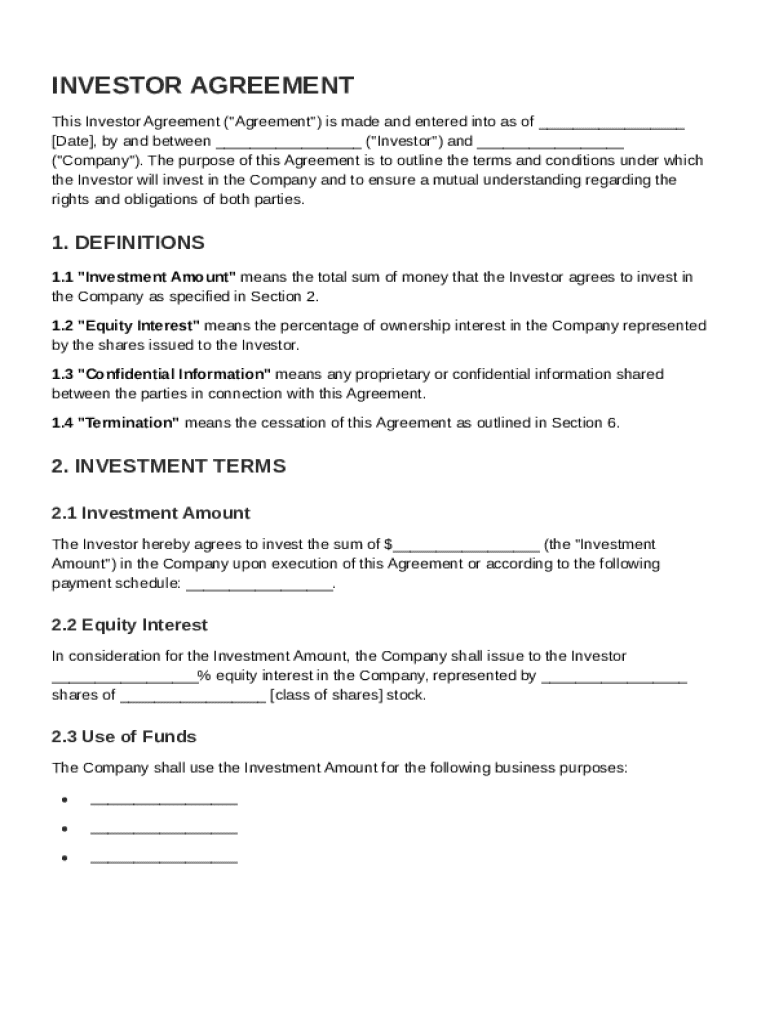 An investor agreement is a legal document that defines the terms and conditions between an investor and a company. This contract outlines expectations, responsibilities, and the implications for both parties involved. Clarity in these terms is crucial for avoiding misunderstandings and ensuring that both the investor and the company are on the same page regarding their roles.