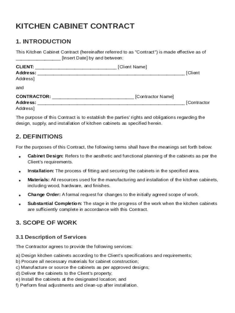 A kitchen cabinet contract is a legal document that outlines the agreement between a client and a contractor for the design, installation, and procurement of kitchen cabinets. It ensures all parties are on the same page regarding expectations, responsibilities, and timelines, which is crucial to a successful project. Knowing what a kitchen cabinet contract entails helps prevent disputes and misunderstandings.