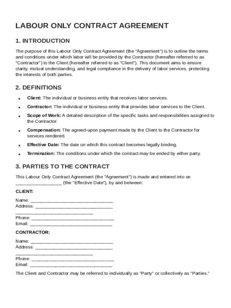 This document outlines the terms and conditions under which labor services will be provided by the Contractor to the Client, ensuring clarity and legal compliance.