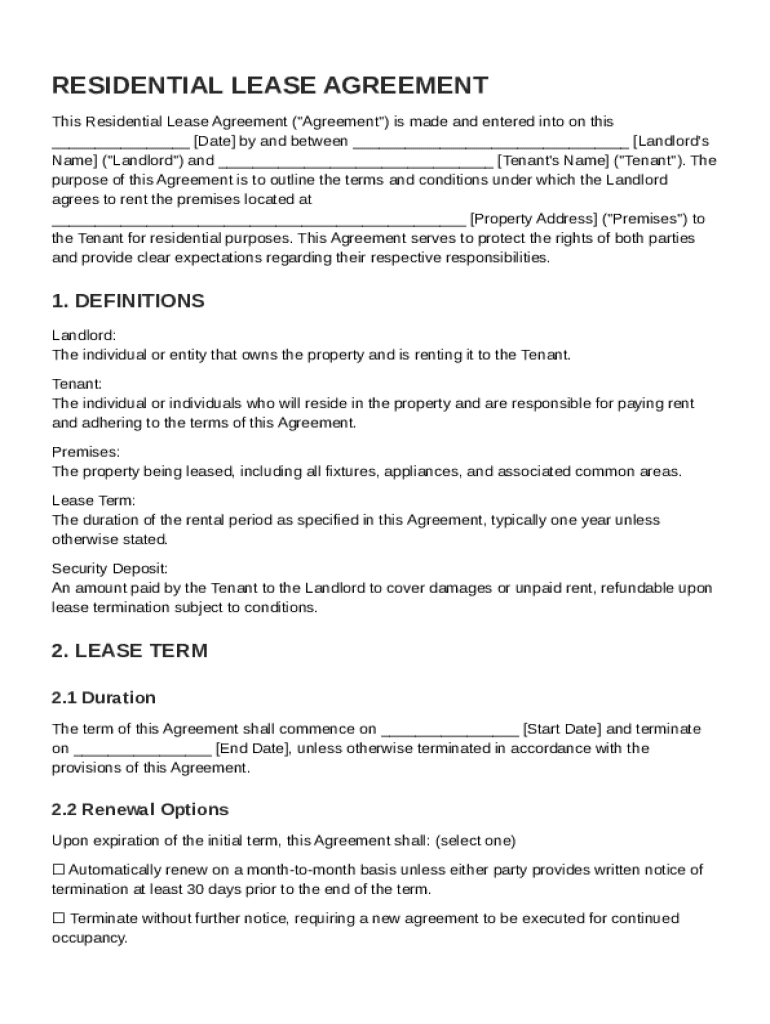 This document outlines the terms and conditions under which the Landlord agrees to rent a residential property to the Tenant, including definitions, lease term, rent details, security deposit, maintenance