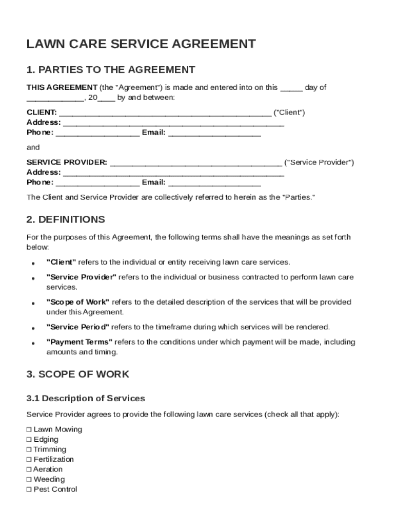 This document outlines the terms and conditions for a lawn care service agreement between a client and a service provider, including details about parties, scope of work, payment terms, responsibilities,