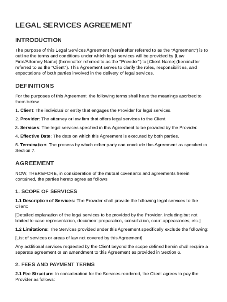 A legal services agreement defines the scope of work and services offered by a legal provider.