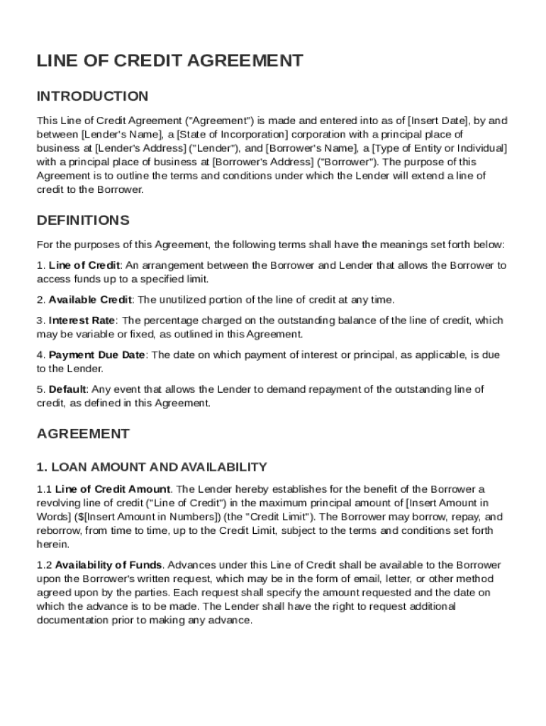 This document outlines the terms and conditions under which a lender extends a line of credit to a borrower, including definitions, repayment terms, fees, and covenants.