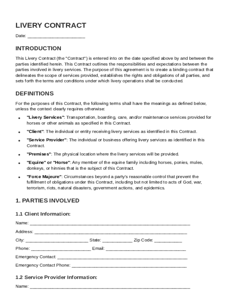 This Livery Contract outlines the responsibilities and expectations for livery services provided for horses or other animals, detailing the terms of service between the Client and the Service Provider.