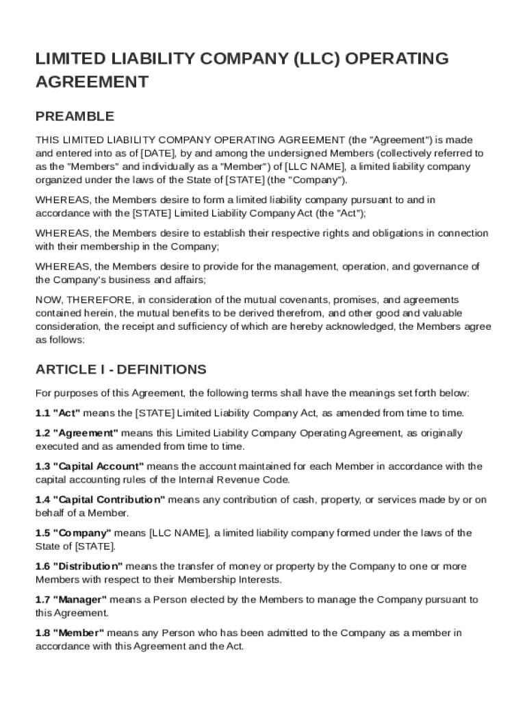 Your LLC operating agreement should include several key sections to ensure comprehensive coverage of operational details.