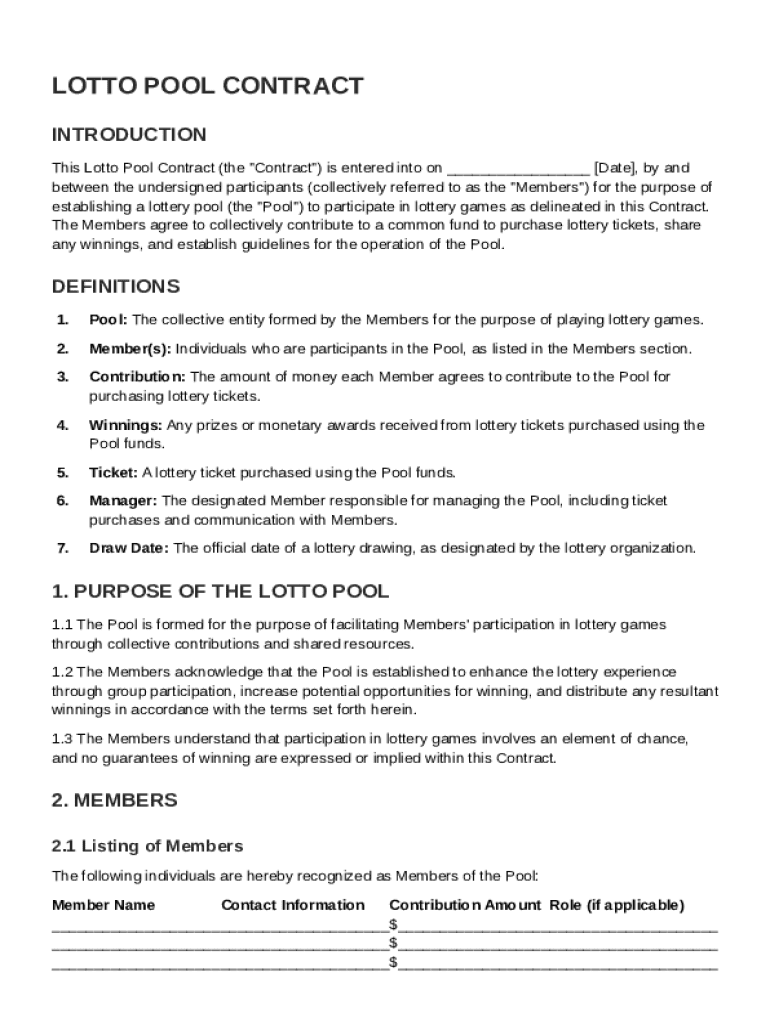 An effective Lotto Pool Contract is built upon several essential elements that define the relationship among pool members. Understanding these terms ensures clarity and helps prevent disputes. Key components typically include details about the pool itself, the members involved, their contributions, any winnings to be shared, the role of a manager, and the drawn date for the lottery.