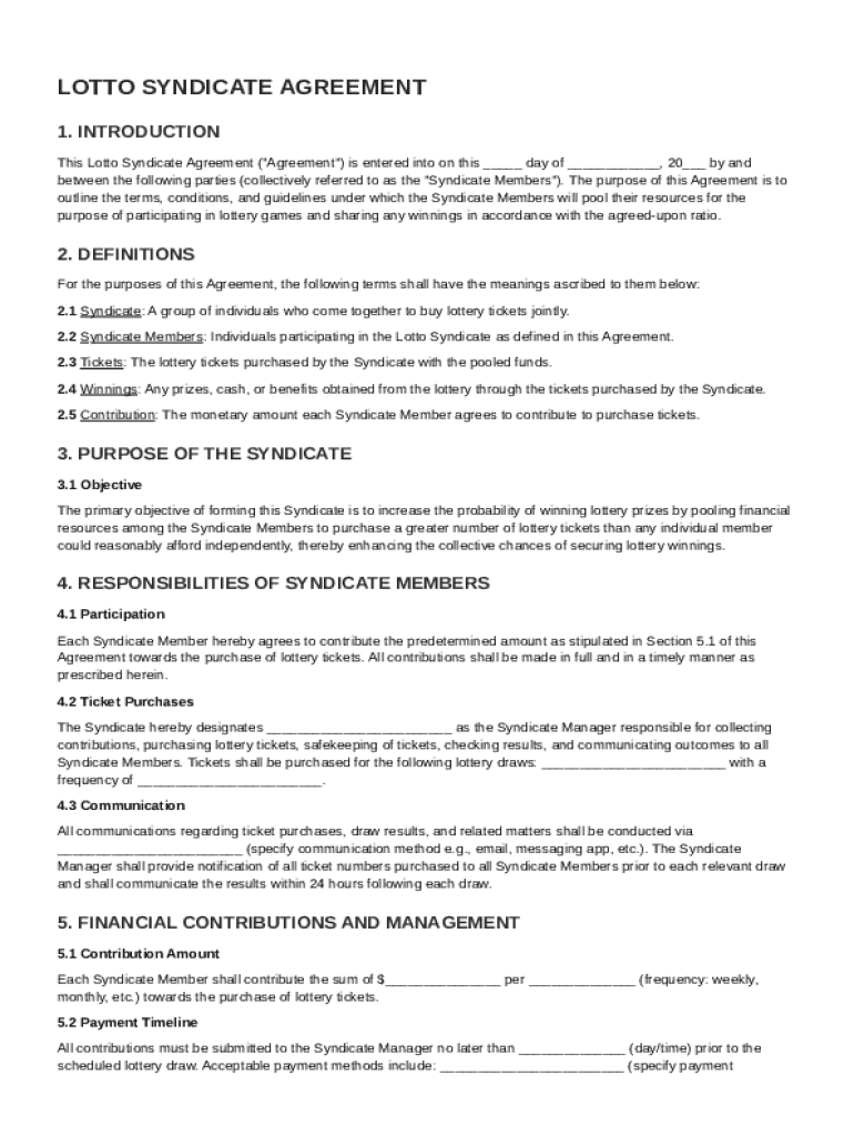 A Lotto Syndicate Agreement is a legally binding document that outlines the terms under which a group of individuals, known as syndicate members, pool their resources to buy lottery tickets together. By joining forces, members enhance their chances of winning while sharing the benefits of any winnings.