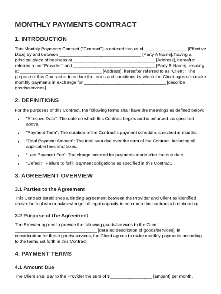 A Monthly Payments Contract is a legally binding agreement between a provider and a client outlining the terms of monthly payments for goods or services. Understanding its definition and importance is crucial for all parties involved.