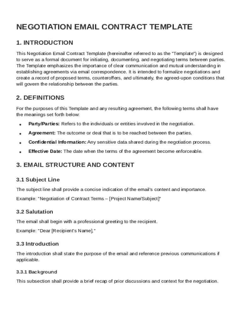 A Negotiation Email Contract Template is a pre-formatted document that outlines the terms and conditions to be negotiated via email between parties.