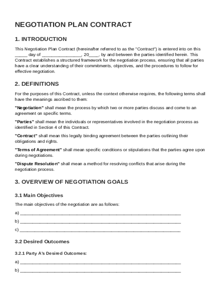 The Negotiation Plan Negotiation Contract Template is a structured document designed to outline the terms and conditions of a negotiation agreement between parties. It serves as a roadmap to guide negotiations, ensuring that all critical elements are addressed systematically.