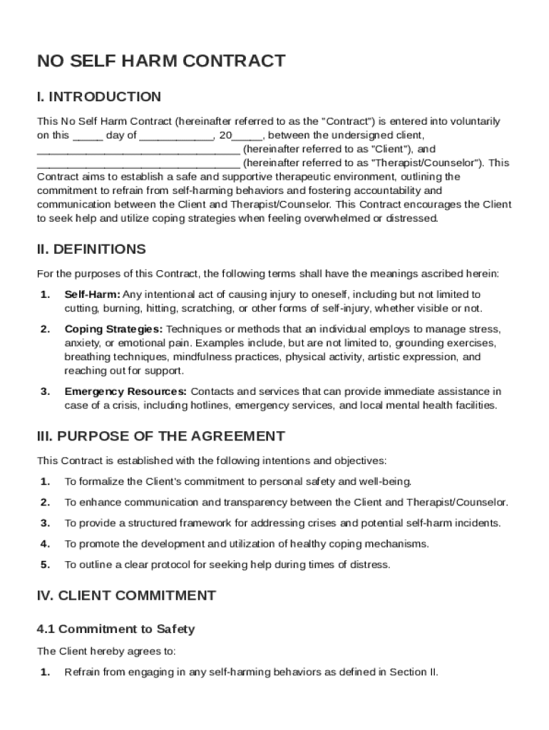 The No Self Harm Contract is a therapeutic agreement that outlines a client's commitment to refrain from self-harming behaviors. This contract serves not only as a formal agreement but also as an essential safety tool in mental health treatments.