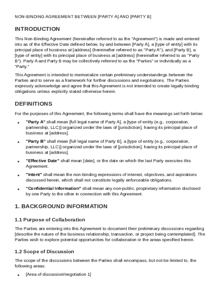 A well-structured template ensures clarity in agreements. Important elements include definitions and clarifications on the terms, roles of each party, effective dates, and the intent behind the non-binding nature of the contract.