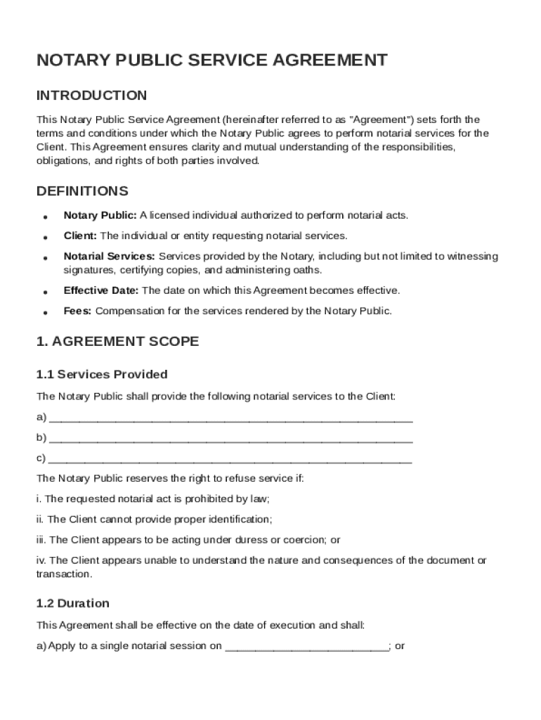 This Agreement outlines the terms and conditions under which a Notary Public performs notarial services for a Client, detailing their responsibilities, obligations, and rights.
