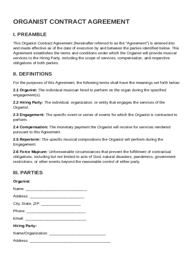 This agreement establishes the terms and conditions under which the Organist will provide musical services to the Hiring Party, including services, compensation, and obligations.