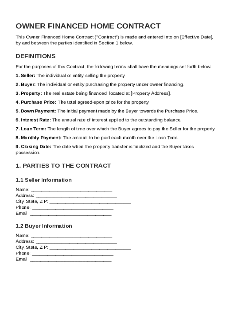 This document outlines the terms and conditions of an owner financing arrangement for purchasing real estate, including definitions of key terms, parties involved, property description, payment terms,