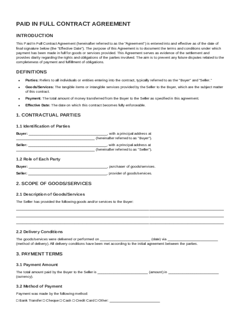 A Paid In Full Contract Template is a legal document that confirms the full payment of a debt or obligation between parties.