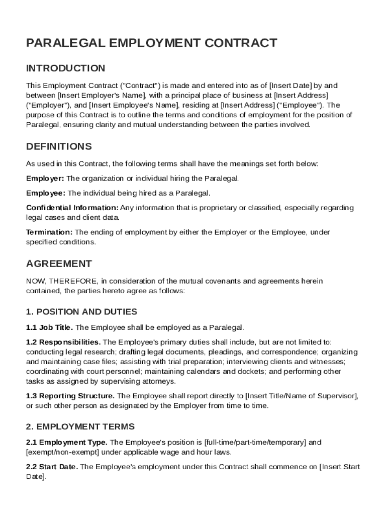 The following are the primary sections you will find in a typical Paralegal Employment Contract Template: