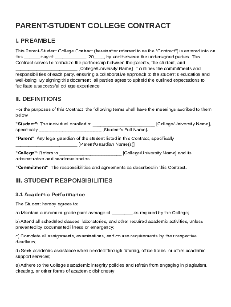 Every comprehensive contract should include essential sections that clarify expectations for both students and parents. This includes a preamble that introduces the contract, definitions of key terms, and specific responsibilities outlined for each party.