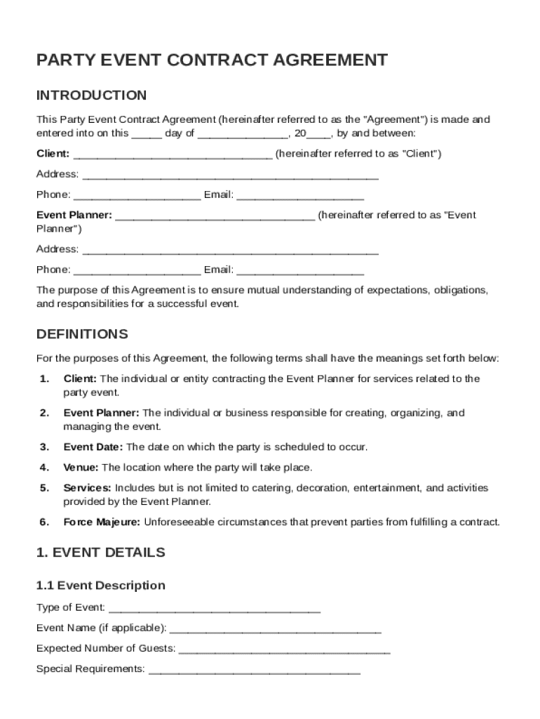 This document outlines the terms and conditions for a party event between a Client and an Event Planner, including responsibilities, payment terms, and liability issues.