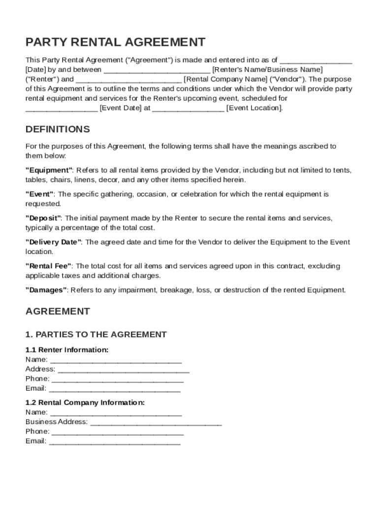 A party rental agreement is a formal contract between a renter and a vendor detailing the terms of renting equipment for events. This agreement plays a critical role in protecting the interests of both parties involved, ensuring that there are clear expectations. In essence, it sets legal protections and helps avoid misunderstandings.