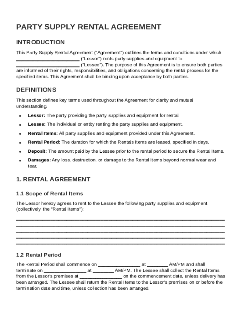 This Agreement outlines the terms and conditions under which a lessor rents party supplies and equipment to a lessee. It covers rental items, payment terms, responsibilities of both parties, cancellations,