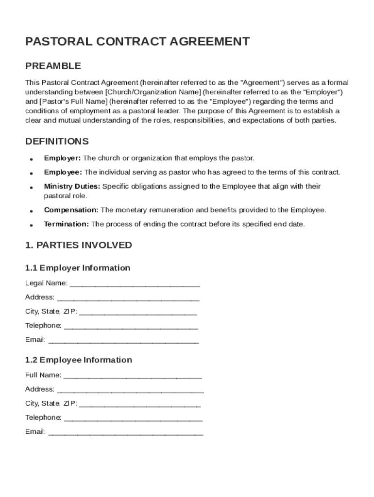 Identifying the employer and employee correctly is fundamental in any Pastoral Contract Agreement. The employer is usually a church organization, which assumes certain roles and responsibilities. The employee, in this case the pastor, must also clearly define their duties and commitments to the congregation.
