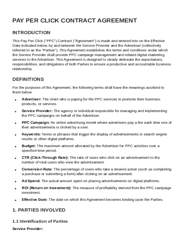 A Pay Per Click (PPC) contract outlines the terms and conditions between the service provider and the advertiser for advertising services. It ensures that both parties clearly understand the project’s scope, payment structure, and performance expectations to achieve successful campaigns. A well-defined agreement can prevent misunderstandings and disputes, making it essential for effective collaboration.