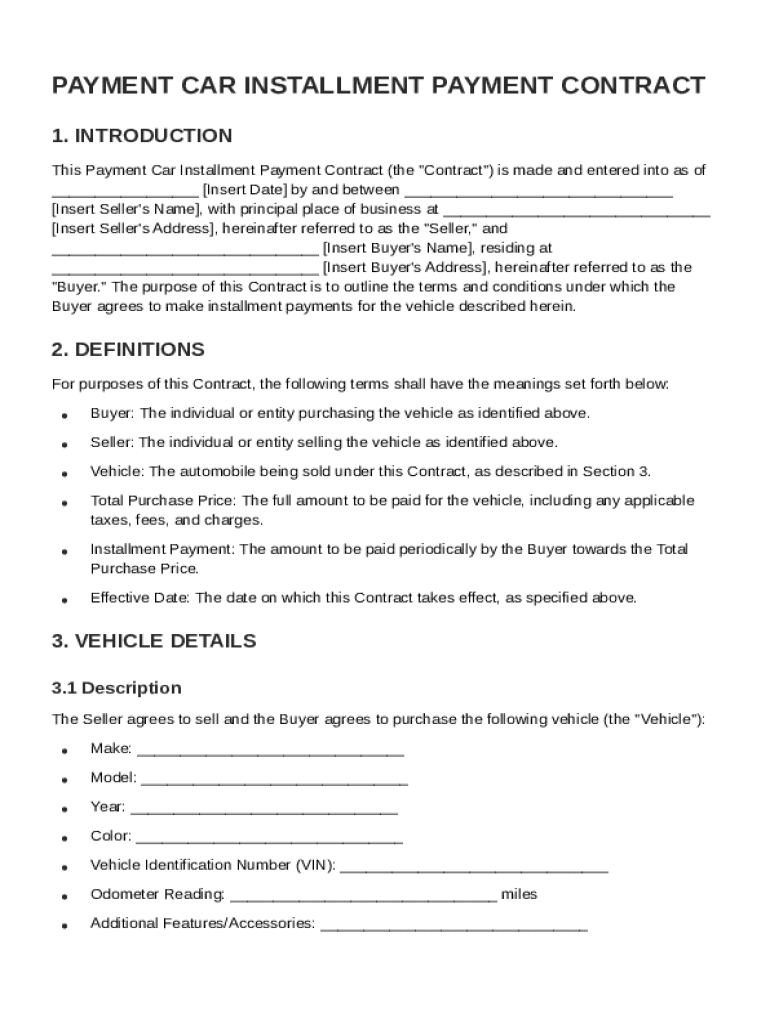 This document outlines the terms and conditions under which the Buyer agrees to make installment payments for the vehicle purchased from the Seller.