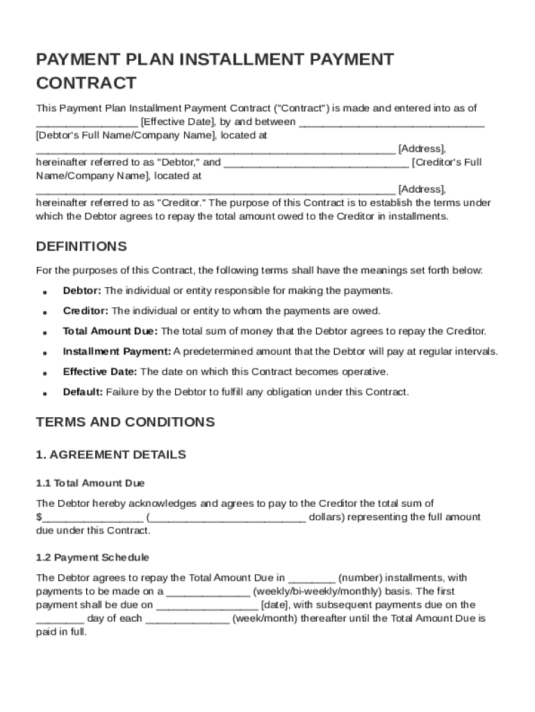 A Payment Plan Installment Payment Contract Template is a legal document that outlines the terms and conditions of a payment plan between a debtor and a creditor.