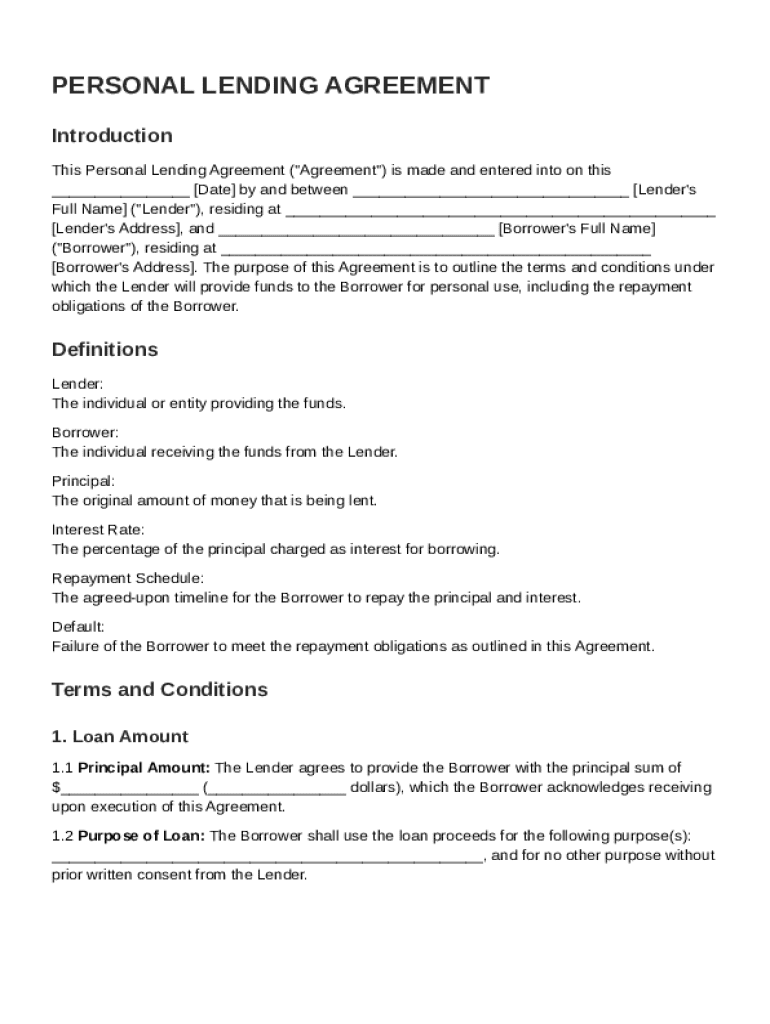 A personal lending agreement is a legal document that outlines the terms under which a lender provides money to a borrower. These agreements help solidify the understanding of repayment terms, including the loan amount, interest rate, and payment schedule. It is essential for protecting both parties in case of disputes.