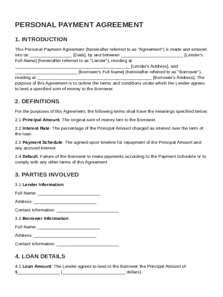 If you're looking to establish a well-documented personal payment agreement, you'll want to focus on accurately defining the roles of the lender and borrower, the amount being borrowed, and any interest fees that may apply.