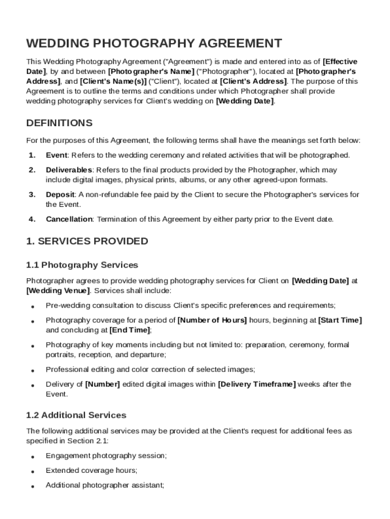 This Agreement outlines the terms and conditions under which a photographer will provide photography services for a wedding, detailing services, payment terms, client responsibilities, rights, and