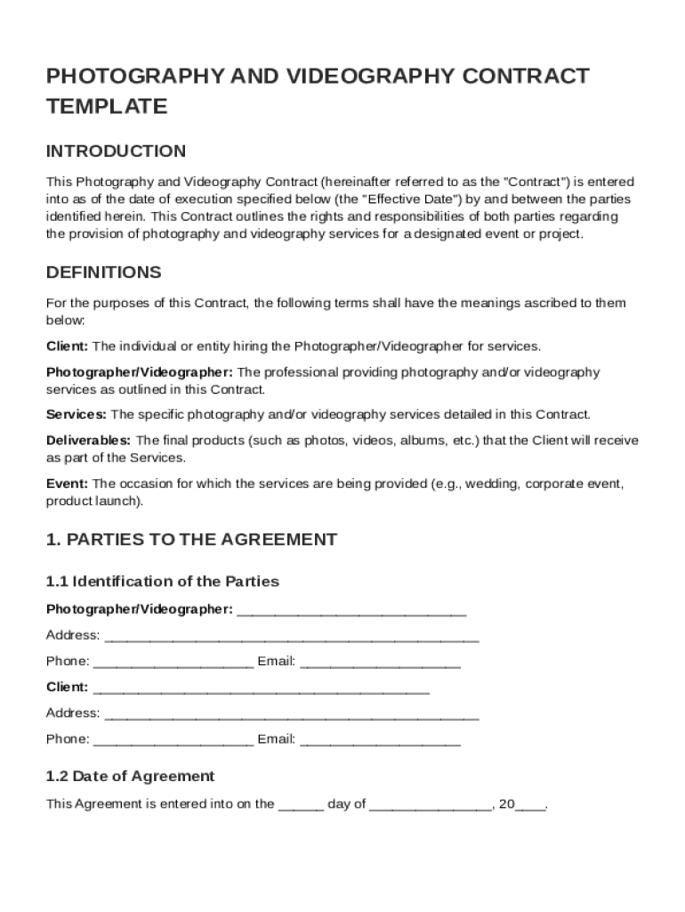 Filling out a photography and videography contract template involves several key elements, including clearly defining the agreement's scope, identifying both parties, and outlining payment terms and deliverables.