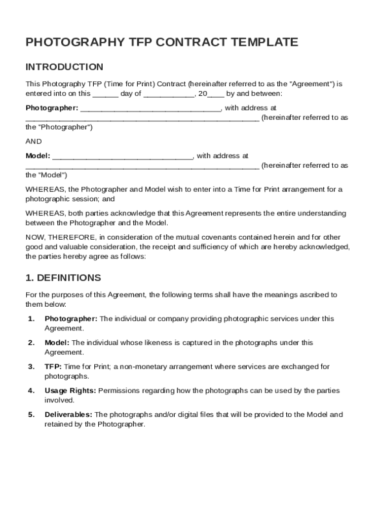 A Photography Tfp Contract Template is a legal document that outlines the terms and agreements between photographers and models working on a Time for Print (TFP) basis.