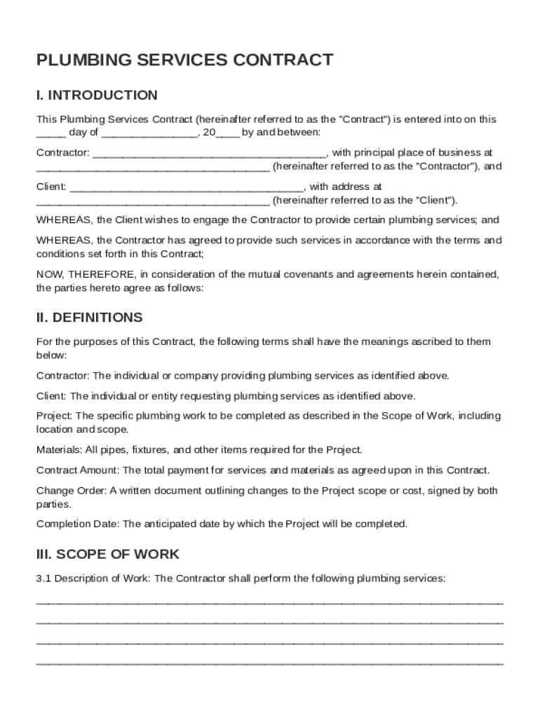 Each section of the plumbing contract template serves a particular purpose in defining the parameters of the agreement. The introductory sections introduce the parties involved and set the framework. Specific definitions, scope of work, payment terms, and change orders detail the obligations and expectations, making these sections critical for clarity.
