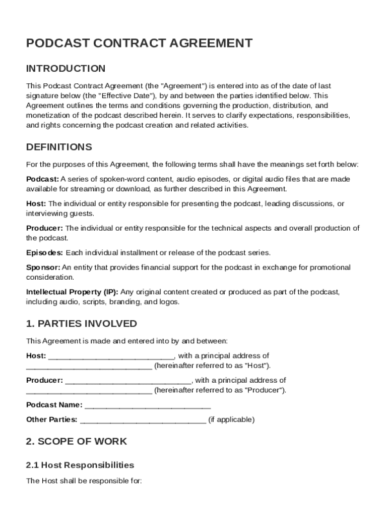 A Podcast Contract Template is a formal agreement outlining the terms, responsibilities, and rights of parties involved in the production and distribution of a podcast.
