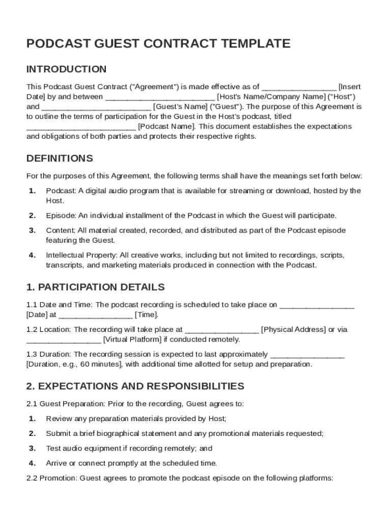 A Podcast Guest Contract Template is a formal agreement outlining the expectations, responsibilities, and rights of podcast hosts and their guests.